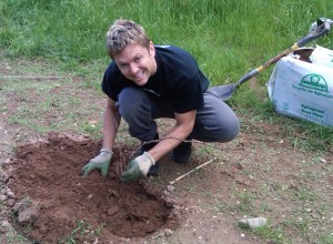 As summer approaches, it is time to garden! Even if you only have room for a few plants–plant something! It’s one of my secrets to a happy life. My theory is that taking care of something living brings more life to your life. I got a little too eager beaver this year and planted my vegetable garden on a warm day in April. Last week’s cold snap claimed a few tomatoes and my farmer neighbor admonished me: “Don’t you know not to plant until after the first new moon after Mother’s Day.” Now I know! (At left, me beginning a lifelong project by planting the first grapevine in Edgewater Farm’s new vineyard.) The Farmer’s Almanac is a great resource for such tips, including: “When the leaves on the ash tree are as big as a squirrel’s paw, it is time to plant corn.” May sound corny, but farmer’s swear by it! Happy planting!